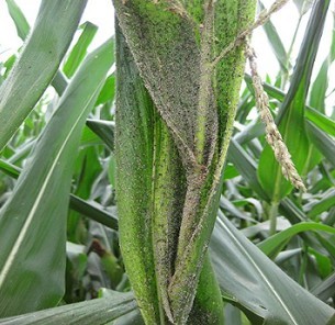 危害特征:玉米蚜多群集在心葉,為害葉片時分泌蜜露,產生黑色霉狀物。成、若蚜刺吸植物組織汁液,引致葉片變黃或發紅,影響生長發育,嚴重時植株枯死。別于高粱蚜。 在緊湊型玉米上主要為害雄花和上層1—5葉,下部葉受害輕,刺吸玉米的汁液,致葉片變黃枯死,常使葉面生霉變黑,影響光合作用,降低粒重,并傳播病毒病造成減產。